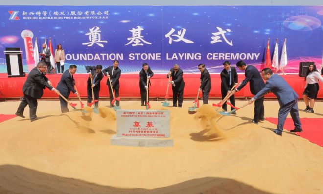 4月30日,新興鑄管埃及25萬噸鑄管項目在阿拉伯埃及共和國中埃·泰達蘇伊士經貿合作區舉行開工奠基儀式,標志著新興鑄管第一個海外鑄管生產基地正式進入建設階段。