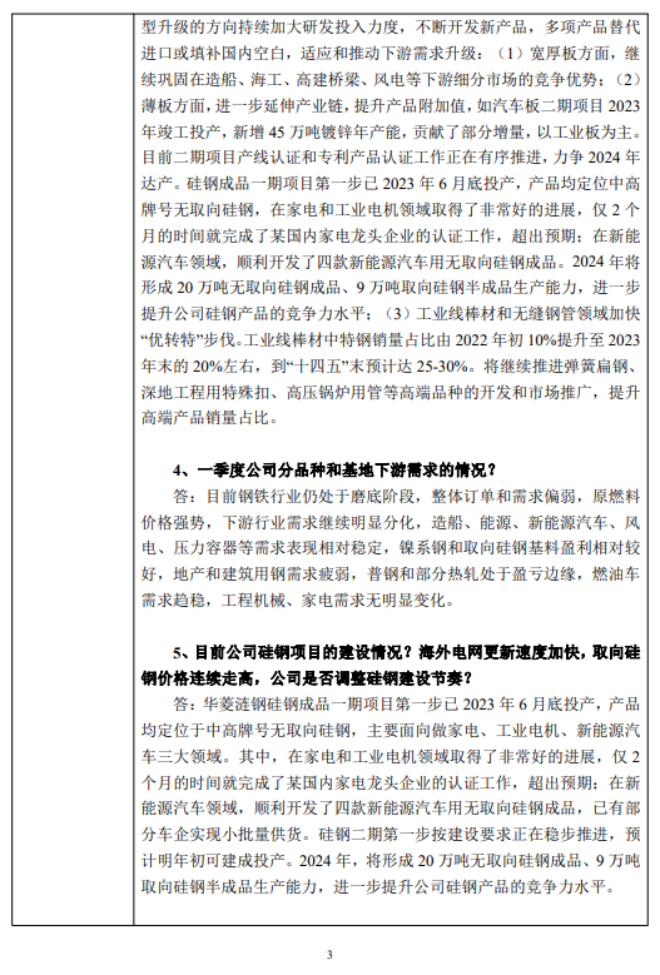 答:近年來,公司堅(jiān)持差異化戰(zhàn)略,瞄準(zhǔn)我國工業(yè)用鋼領(lǐng)域需求轉(zhuǎn)型升級(jí)的方向持續(xù)加大研發(fā)投入力度,不斷開發(fā)新產(chǎn)品,多項(xiàng)產(chǎn)品替代進(jìn)口或填補(bǔ)國內(nèi)空白,適應(yīng)和推動(dòng)下游需求升級(jí):(1)寬厚板方面,繼續(xù)鞏固在造船、海工、高建橋梁、風(fēng)電等下游細(xì)分市場的競爭優(yōu)勢(shì);(2)薄板方面,進(jìn)一步延伸產(chǎn)業(yè)鏈,提升產(chǎn)品附加值,如汽車板二期項(xiàng)目2023年竣工投產(chǎn),新增45萬噸鍍鋅年產(chǎn)能,貢獻(xiàn)了部分增量,以工業(yè)板為主。目前二期項(xiàng)目產(chǎn)線認(rèn)證和專利產(chǎn)品認(rèn)證工作正在有序推進(jìn),力爭2024年達(dá)產(chǎn)。硅鋼成品一期項(xiàng)目第一步已2023年6月底投產(chǎn),產(chǎn)品均定位中高牌號(hào)無取向硅鋼,在家電和工業(yè)電機(jī)領(lǐng)域取得了非常好的進(jìn)展,僅2個(gè)月的時(shí)間就完成了某國內(nèi)家電龍頭企業(yè)的認(rèn)證工作,超出預(yù)期;在新能源汽車領(lǐng)域,順利開發(fā)了四款新能源汽車用無取向硅鋼成品。2024年將形成 20萬噸無取向硅鋼成品、9萬噸取向硅鋼半成品生產(chǎn)能力,進(jìn)一步提升公司硅鋼產(chǎn)品的競爭力水平;(3)工業(yè)線棒材和無縫鋼管領(lǐng)域加快“優(yōu)轉(zhuǎn)特”步伐。工業(yè)線棒材中特鋼銷量占比由2022年初10%提升至2023年末的 20%左右,到“十四五”末預(yù)計(jì)達(dá)25-30%。將繼續(xù)推進(jìn)彈簧扁鋼、深地工程用特殊扣、高壓鍋爐用管等高端品種的開發(fā)和市場推廣,提升高端產(chǎn)品銷量占比。