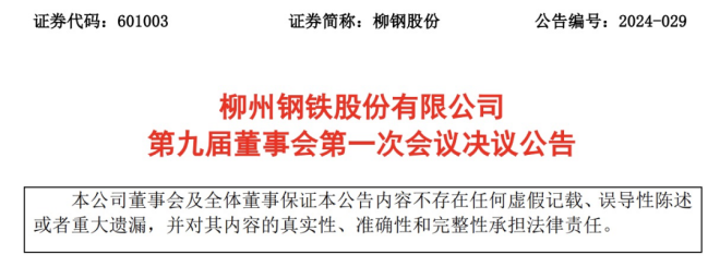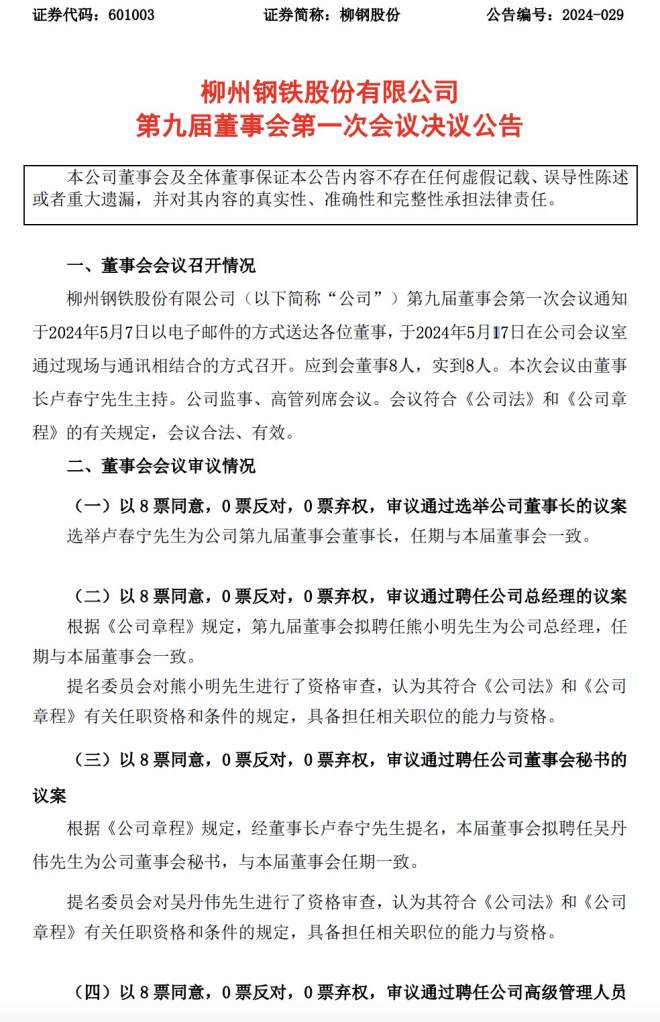 5月18日,柳鋼股份發(fā)布了《柳州鋼鐵股份有限公司第九屆董事會第一次會議決議公告》(以下簡稱《公告》)。