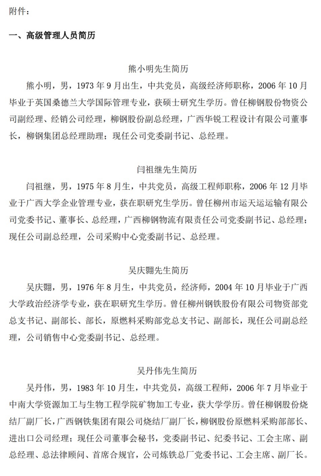熊小明,男,1973年9月出生,中共黨員,高級經(jīng)濟師職稱,2006年10月畢業(yè)于英國桑德蘭大學國際管理專業(yè),獲碩士研究生學歷。曾任柳鋼股份物資公司副經(jīng)理、經(jīng)銷公司經(jīng)理,柳鋼股份副總經(jīng)理,廣西華銳工程設計有限公司董事長,柳鋼集團總經(jīng)理助理;現(xiàn)任公司黨委副書記、總經(jīng)理。