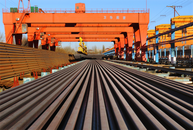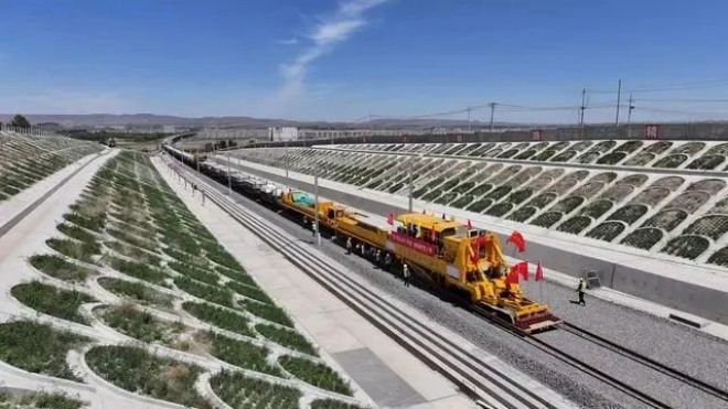 5月15日10時,烏蘭察布市豐鎮市集大原高鐵建設現場,機械設備將500米長軌、軌枕一次性鋪設到位,標志著集寧經大同至原平高速鐵路(以下簡稱“集大原高鐵”)集寧至大同段開始鋪軌。包鋼產2430噸60N U71MnH G鋼軌在整條線路上完成供貨并率先鋪設。