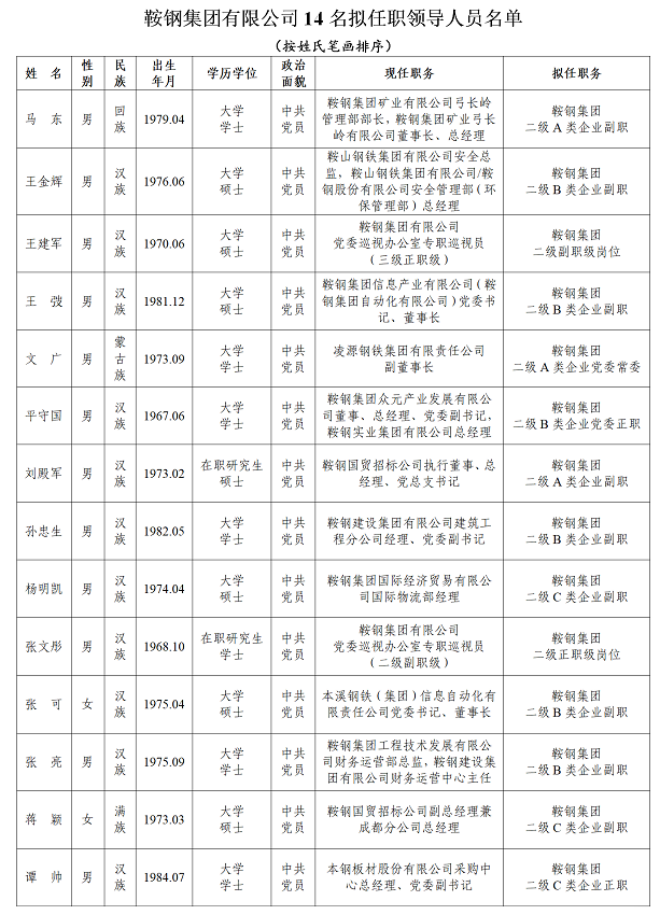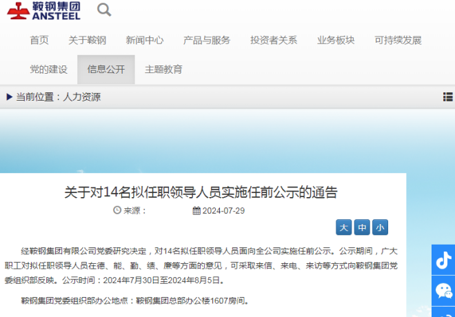 7月29日,鞍鋼集團(tuán)官網(wǎng)發(fā)布了《關(guān)于對(duì)14名擬任職領(lǐng)導(dǎo)人員實(shí)施任前公示的通告》。