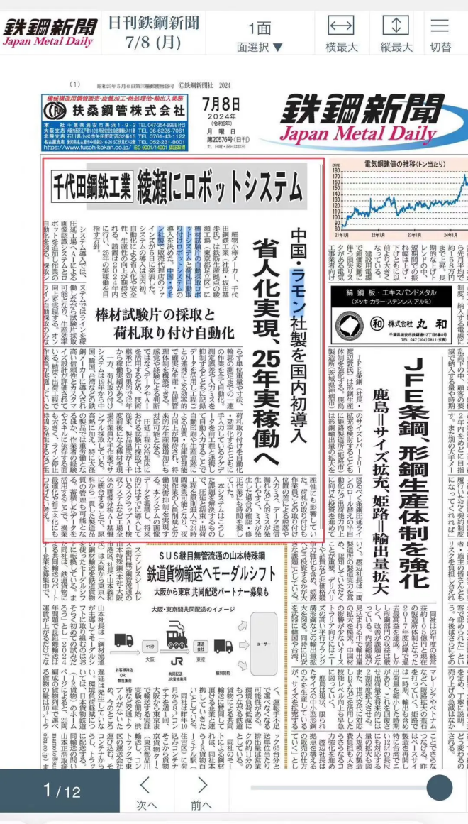 2024年7月8日,據日本《鋼鐵新聞》和《產業新聞》等權威媒體報道:為積極推動智能化新技術、新裝備,提高自動化水平,節省人力,提高安全性和生產率,日本知名鋼企——千代田鋼鐵工業株式會社,在其螺紋鋼生產基地綾瀨工廠(東京都足立區)引入鐳目公司創新研發的機械手棒材取樣系統和機械手焊標系統。這是日本鋼企首次引入兩種中國企業研發的智能化創新系統。