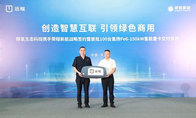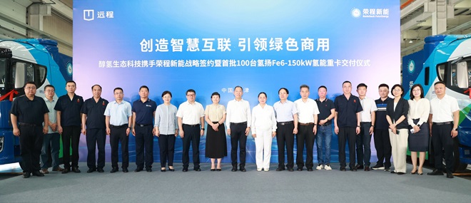 8月6日,榮程新能集團攜手醇氫生態科技戰略簽約暨首批100臺氫能重卡交付儀式在吉利遠程新能源商用車天津生產基地隆重舉行。此次遠程向榮程交付的氫燃料重卡,搭載了榮程氫揚動力Fe6-150kw氫燃料電池系統,具備大功率、長續航、低功耗特點,將陸續投入到京津冀環渤海區域省際干線物流及鋼鐵、港口等大宗物資運輸場景,助力京津冀綠色運力升級。這也意味著榮程新能累計投運氫能重卡數量將達到459輛,繼續在國內氫能重卡運輸領域領跑。