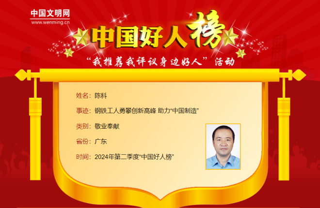 7月30日,2024年第二季度“中國好人榜”發布儀式暨全國道德模范與身邊好人現場交流活動在山西省大同市舉辦。經各地推薦、網友評議和專家評審等環節,共有153人(組)助人為樂、見義勇為、誠實守信、敬業奉獻、孝老愛親身邊好人光榮上榜。寶武集團中南股份陳科位列其中(“敬業奉獻”類)。