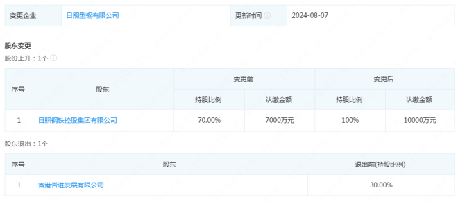 8月7日,據(jù)企查查顯示,日照鋼鐵控股集團(tuán)有限公司在日照型鋼有限公司的持股比例上升,從70%增加到100%,日照型鋼有限公司成為日照鋼鐵控股集團(tuán)有限公司100%控股子公司,具體情況如下:
