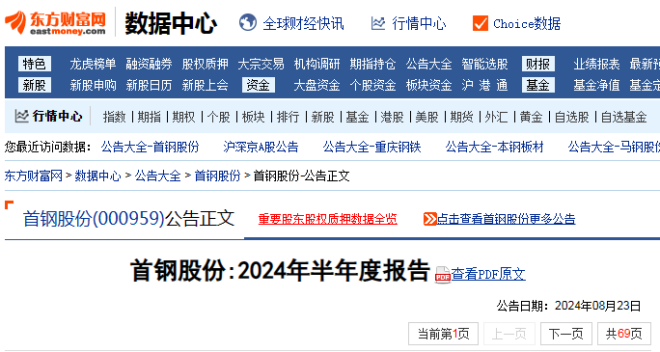報告中數據顯示:2024年上半年,首鋼股份實現營業收入566.84億元,同比下降1.19%;實現凈利潤3.95億元,同比下降3.80%。