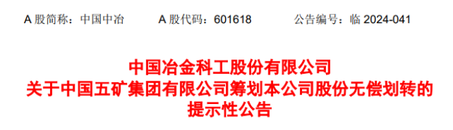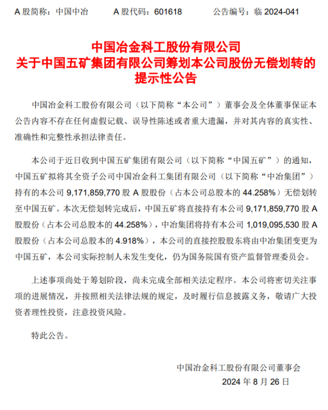 8月27日,中國中冶發布了《中國中冶關于中國五礦集團有限公司籌劃本公司股份無償劃轉的提示性公告》(以下簡稱《公告》)。