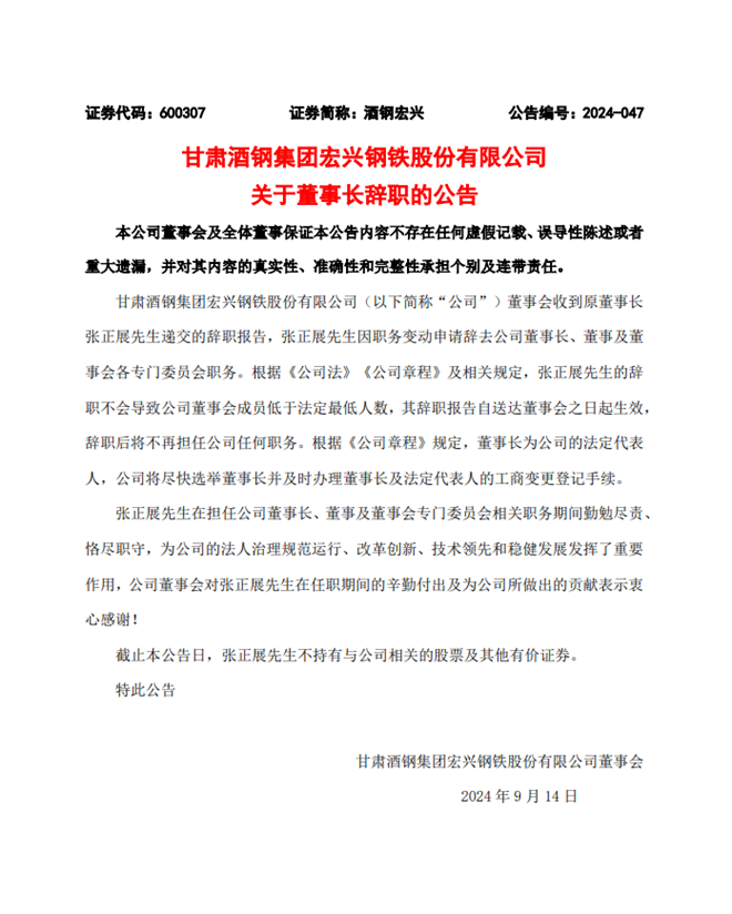 從《公告一》中獲悉,甘肅酒鋼集團宏興鋼鐵股份有限公司董事會收到原董事長張正展先生遞交的辭職報告,張正展先生因職務變動申請辭去公司董事長、董事及董事會各專門委員會職務。