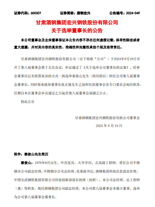 從《公告二》中獲悉,甘肅酒鋼集團宏興鋼鐵股份有限公司于2024年9月18日召開了第八屆董事會第十五次會議,審議通過了《關于選舉公司董事長的議案》,經參會董事以記名投票表決的方式一致選舉秦俊山先生擔任公司第八屆董事會董事長,同時將承接原董事長張正展先生之前擔任的董事會各專門委員會相應職務。任期自本次董事會審議通過之日起至第八屆董事會屆滿之日止。