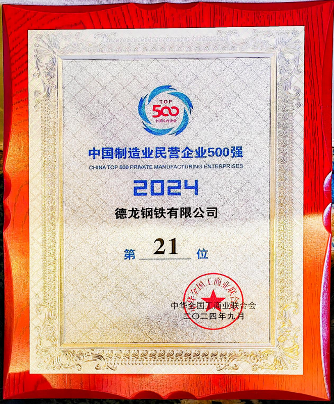 多年來,德龍鋼鐵集團在丁立國董事長的帶領下,始終秉持著理想不改、創新不止、事業向善、惟有奮斗的企業精神,已經發展成為一家跨區域、跨國界的大型綜合鋼鐵集團,如今,德龍鋼鐵已連續三年入榜世界企業 500 強,位列榜單第 452 位,充分展現了其在國際市場的強大影響力。同時,德龍鋼鐵榮登 2024 年中國企業 500 強第 118 位,更是行業內標桿企業地位的有力彰顯。而此次,德龍鋼鐵再傳捷報,榮登 2024 中國制造業民營企業 500 強第 21 位、中國民營企業 500 強第 30 位!