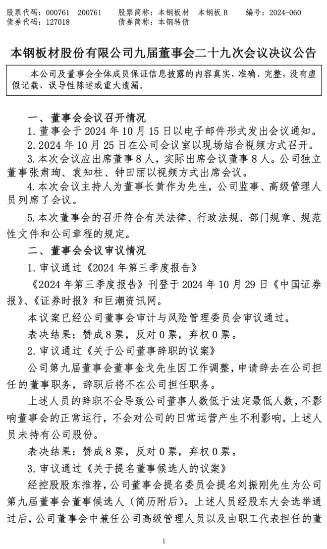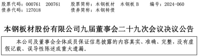 近日,本鋼板材股份有限公司(以下簡稱“公司”)召開九屆董事會二十九次會議,發布《九屆董事會二十九次會議決議公告》(以下簡稱《公告》)。