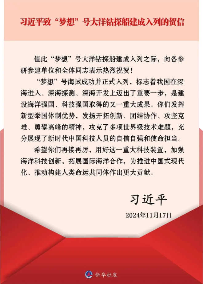 新華社廣州11月17日電 我國自主設計建造的首艘大洋鉆探船“夢想”號17日在廣州正式入列。中共中央總書記、國家主席、中央軍委主席習近平發來賀信,表示熱烈祝賀。