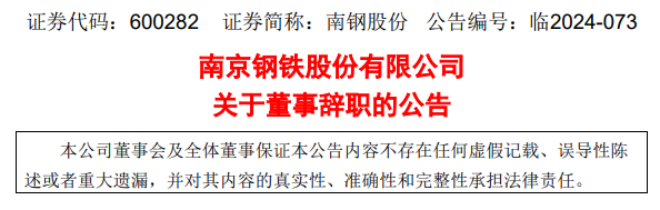 11月23日,南鋼股份發(fā)布了《南京鋼鐵股份有限公司關(guān)于董事辭職的公告》。公告中提到: