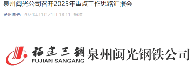 11月21日,從泉州閩光公眾號(hào)發(fā)布的《泉州閩光公司召開(kāi)2025年重點(diǎn)工作思路匯報(bào)會(huì)》一文中獲悉:11月19日-20日,泉州閩光公司黨委書(shū)記、董事陳杞榕帶隊(duì),分別深入煉鐵廠、鋼軋廠、動(dòng)力廠、綜合廠各生產(chǎn)單位,主持召開(kāi)泉州閩光2025年工作思路匯報(bào)會(huì),逐一聽(tīng)取各單位明年重點(diǎn)工作目標(biāo)、思路和舉措。公司相關(guān)領(lǐng)導(dǎo)、各職能部門(mén)負(fù)責(zé)人參加會(huì)議。