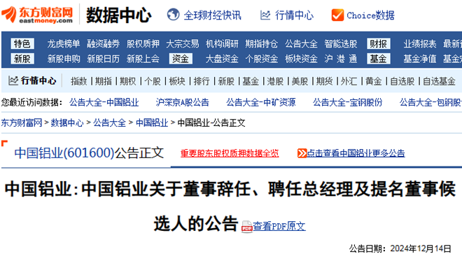 12月14日,中國鋁業發布了關于董事辭任、聘任總經理及提名董事候選人的公告(以下簡稱“公告”)。
