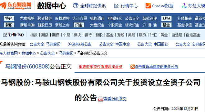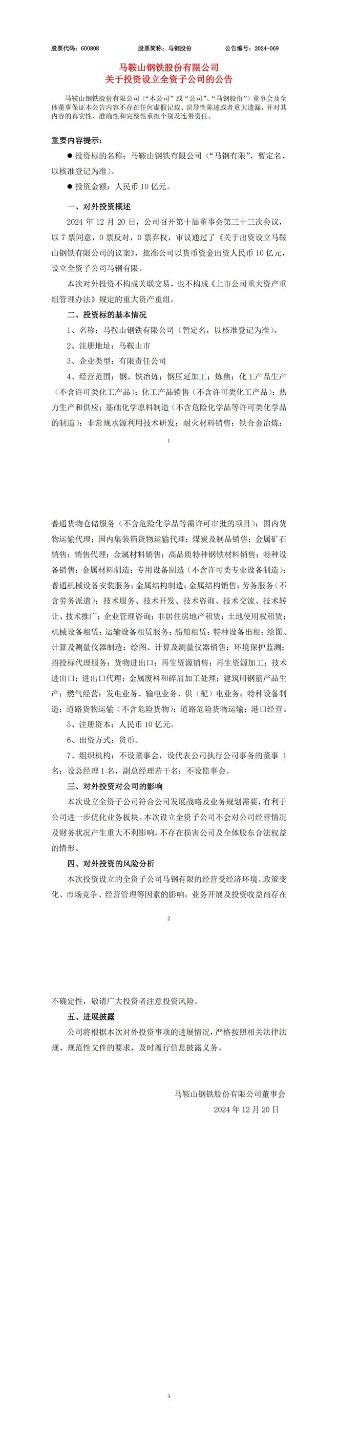 12月21日,馬鋼股份發布了《馬鞍山鋼鐵股份有限公司關于投資設立全資子公司的公告》(以下簡稱“公告”)。
