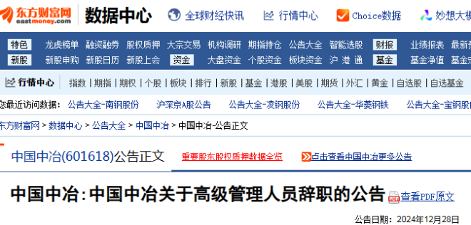 12月28日,中國中冶發布了《中國中冶關于高級管理人員辭職的公告》。
