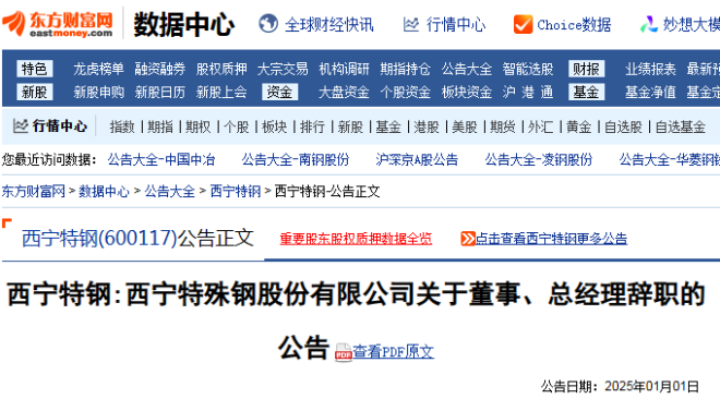 2025年1月1日,西寧特鋼發(fā)布了《西寧特殊鋼股份有限公司關(guān)于董事、總經(jīng)理辭職的公告》。