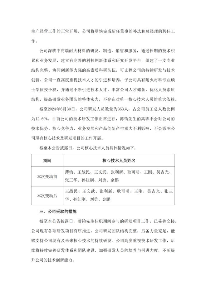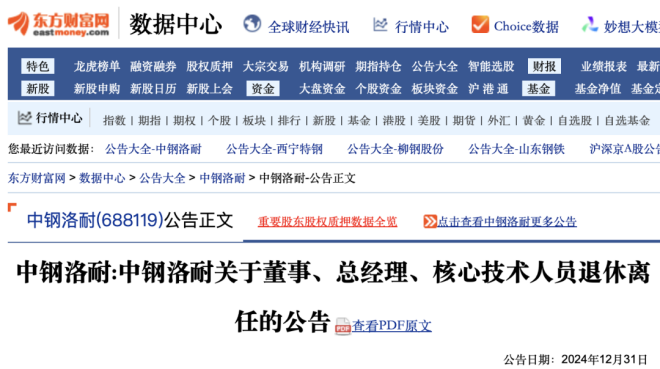 2024年12月31日,中鋼洛耐發布《關于董事、總經理、核心技術人員退休離任的公告》(以下簡稱《公告二》。