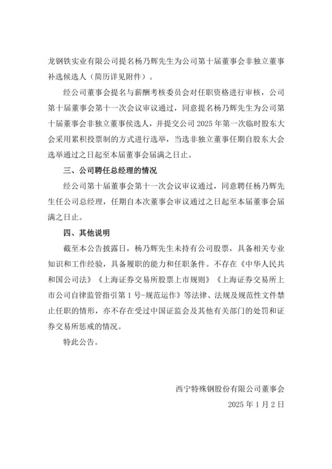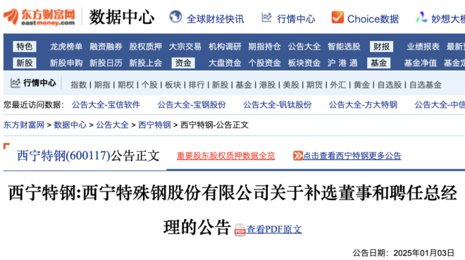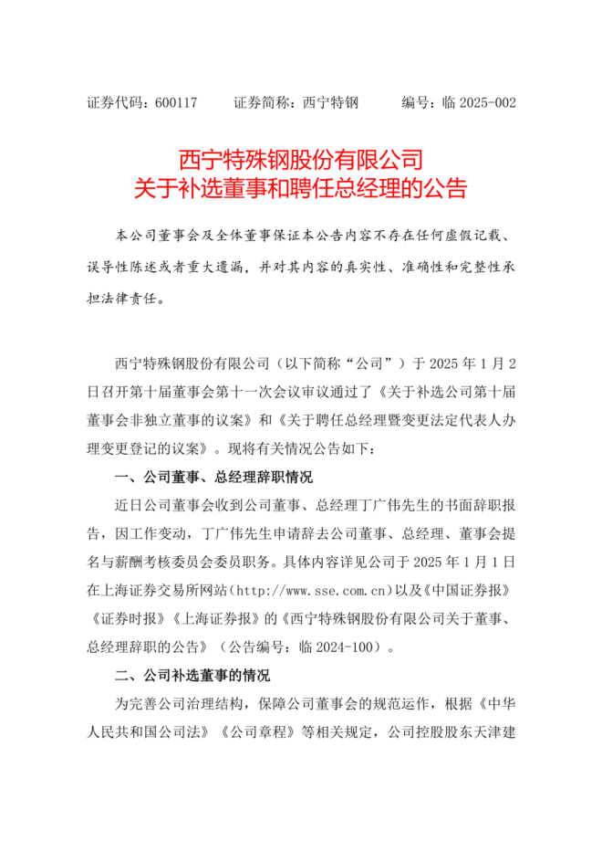 1月3日,西寧特鋼發布《關于補選董事和聘任總經理的公告》(以下簡稱《公告》)。
