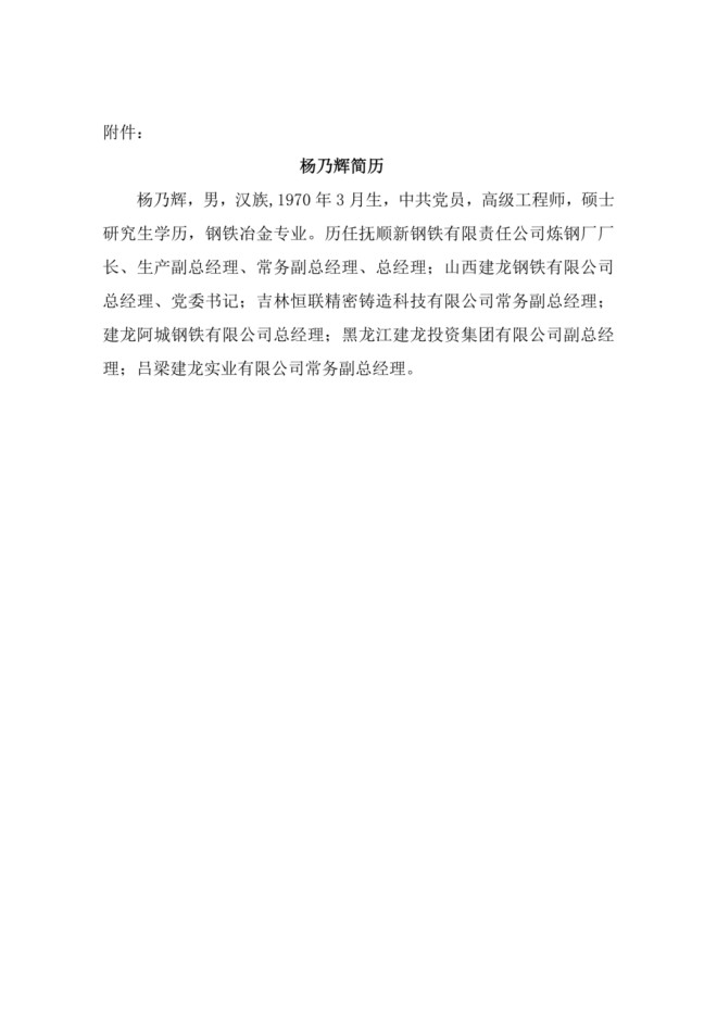 楊乃輝,男,漢族,1970年3月生,中共黨員,高級工程師,碩士 研究生學歷,鋼鐵冶金專業。歷任撫順新鋼鐵有限責任公司煉鋼廠廠長、生產副總經理、常務副總經理、總經理;山西建龍鋼鐵有限公司總經理、黨委書記;吉林恒聯精密鑄造科技有限公司常務副總經理;建龍阿城鋼鐵有限公司總經理;黑龍江建龍投資集團有限公司副總經理;呂梁建龍實業有限公司常務副總經理。