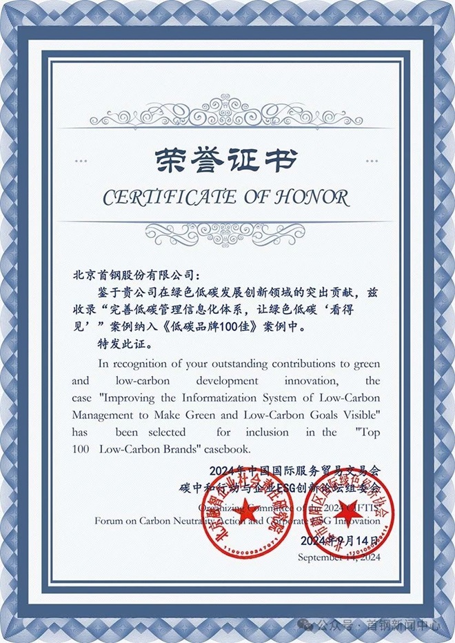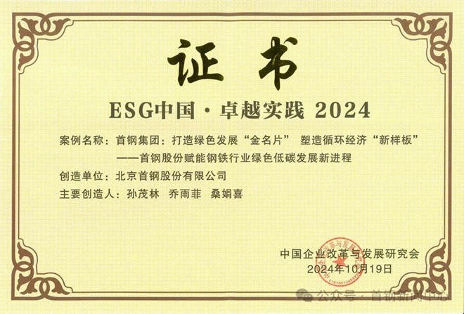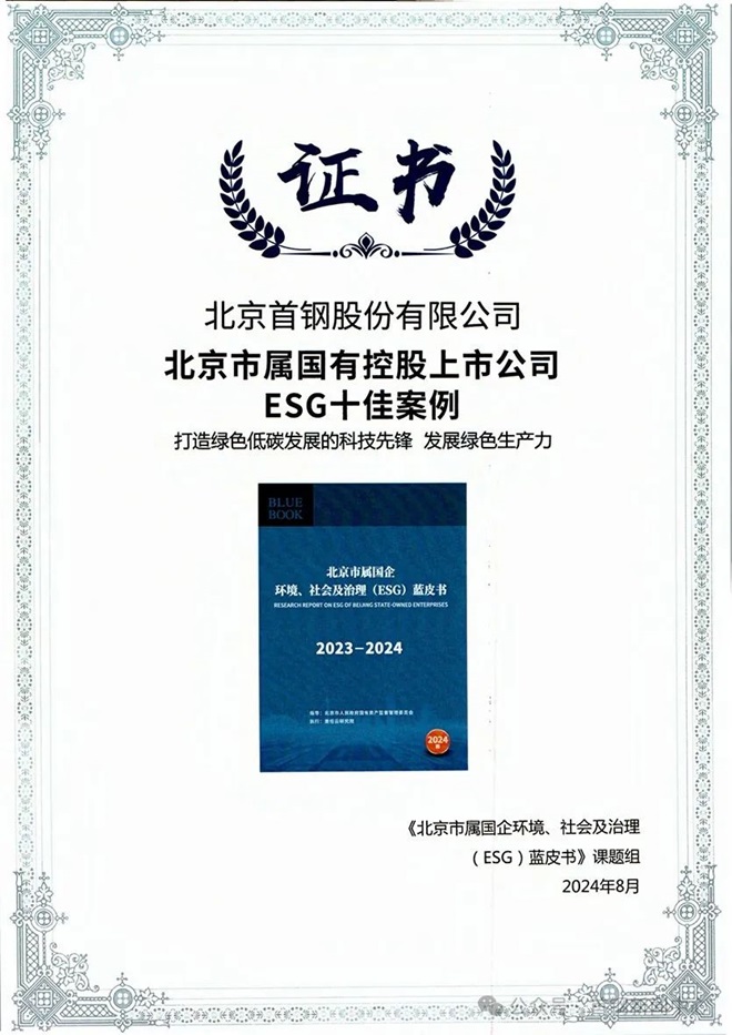 今年以來,首鋼股份獲評“第二屆國新杯·ESG金牛獎百強”企業;《打造綠色低碳發展的科技先鋒 發展綠色生產力》被評為北京市屬國有控股上市公司ESG十佳案例;《完善低碳管理信息化體系,讓綠色低碳“看得見”》被收錄于2024中國服貿會碳中和行動與企業ESG創新論壇組委會編纂的《低碳品牌100佳》案例中;《打造綠色發展“金名片”塑造循環經濟“新樣板”》入選“ESG中國·卓越實踐”案例。