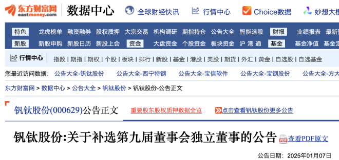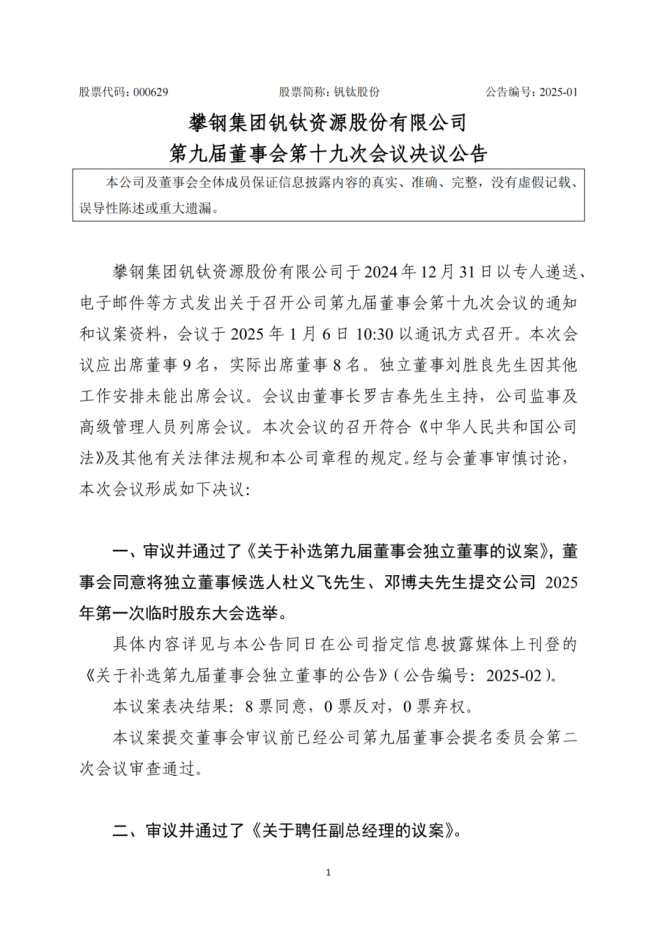 釩鈦股份發布《第九屆董事會第十九次會議決議公告》與《關于補選第九屆董事會獨立董事的公告》。
