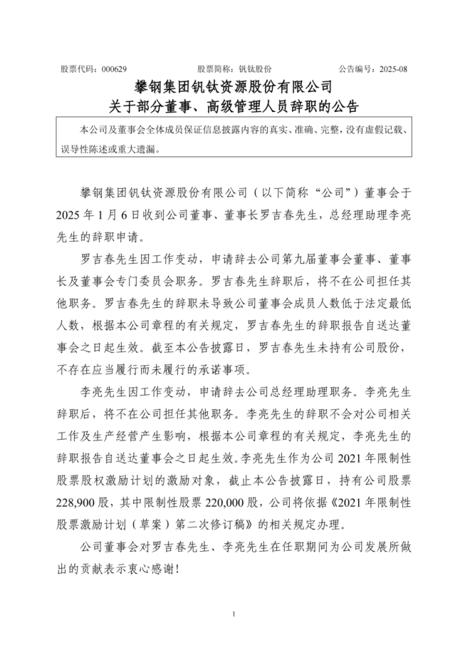 釩鈦股份發布《關于部分董事、高級管理人員辭職的公告》。