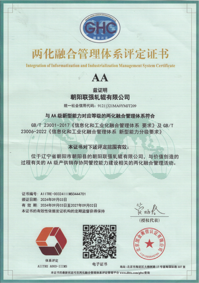 2024年9月2日,聯強軋輥更是成功獲得了兩化融合管理體系AA級認證,標志著公司不僅在數字化工廠建設上邁出堅實步伐,更在信息化與工業化深度融合方面取得了重大突破,為企業持續健康發展奠定了堅實基礎。
