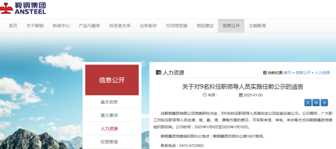 1月5日,鞍鋼集團(tuán)官網(wǎng)發(fā)布了《關(guān)于對(duì)9名擬任職領(lǐng)導(dǎo)人員實(shí)施任前公示的通告》(以下簡(jiǎn)稱(chēng)“通告”)。