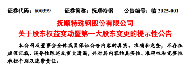 1月14日,撫順特鋼發布了《撫順特殊鋼股份有限公司 關于股東權益變動暨第一大股東變更的提示性公告》。