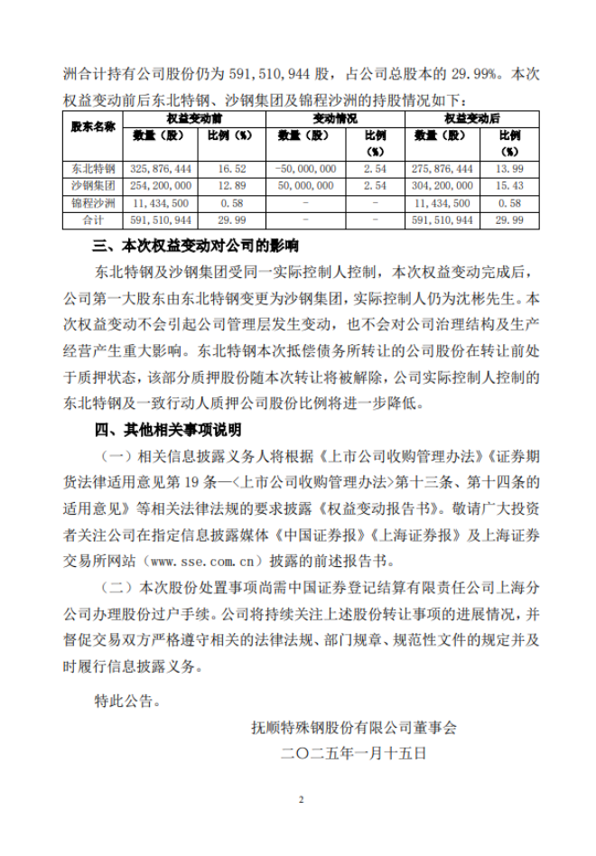本次權益變動不會引起公司管理層發生變動,也不會對公司治理結構及生產經營產生重大影響。東北特鋼擬將質押給沙鋼集團的5000萬股公司股份轉讓給沙鋼集團抵償部分借款,抵償借款對價為2.95億元。本次權益變動完成后,沙鋼集團持股比例上升至15.43%,成為公司第一大股東。東北特鋼及沙鋼集團受同一實際控制人控制。
