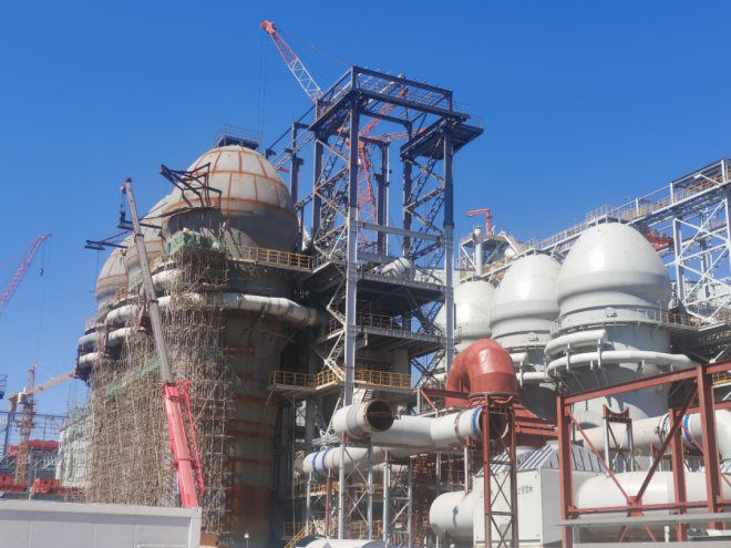 圖為河北唐山東華鋼鐵公司新建2座1580m3、1690m3高爐配套的6座豫興懸鏈線頂燃式熱風爐施工現場。