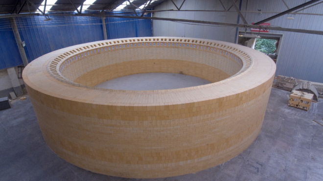 圖為安鋼4747m3高爐豫興懸鏈線頂燃式熱風爐燃燒器預砌現場。
