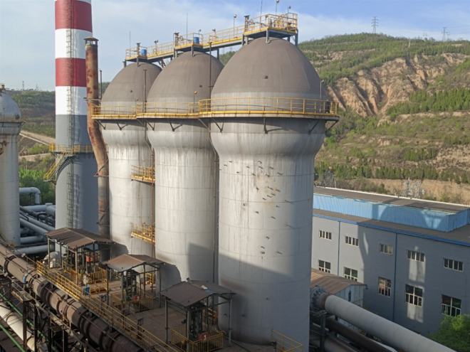 圖為山西中陽鋼鐵公司內燃式熱風爐爐殼利舊改造為豫興懸鏈線頂燃式熱風爐工程。
