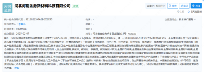 據(jù)企查查信息顯示,2025年2月7日,河北河鋼金源新材料科技有限公司成立,法定代表人為李愛兵,注冊資本為9800萬元,該企業(yè)注冊地址位于河北省唐山市樂亭縣金融街13號,所屬行業(yè)為科技推廣和應(yīng)用服務(wù)業(yè)。