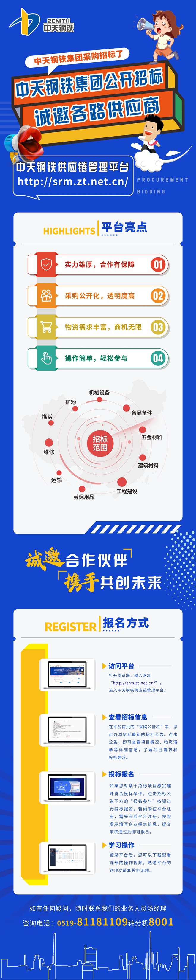 近日,中天鋼鐵集團正式啟動物資采購公開招標,依托“中天鋼鐵供應鏈管理平臺(http://srm.zt.net.cn/)”,向全社會發出“英雄帖”,誠邀資質齊全、信譽良好的供應商伙伴加入,攜手打造鋼鐵行業的優質供應鏈,共同鑄就輝煌未來。