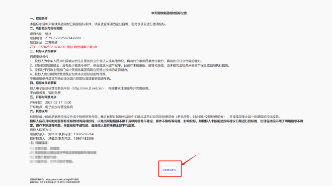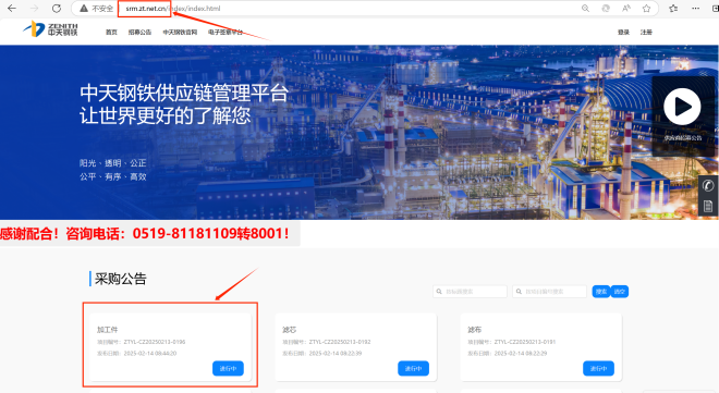 為了進一步提升廣大供應商的參與便捷度,集團不斷簡化“中天鋼鐵供應鏈管理平臺”的操作流程。供應商通過瀏覽器訪問“http://srm.zt.net.cn/”網址,即可查看“采購公告欄”中的招標項目詳情,并自由選擇感興趣的項目報名。平臺提供清晰的報名提示和操作指南,以及一對一的專業指導,幫助新供應商快速熟悉流程,順利開始合作。
