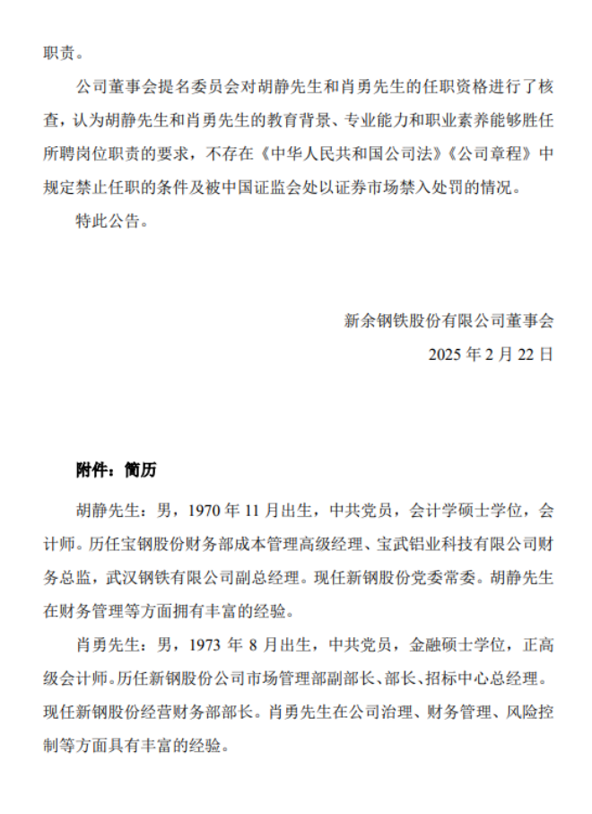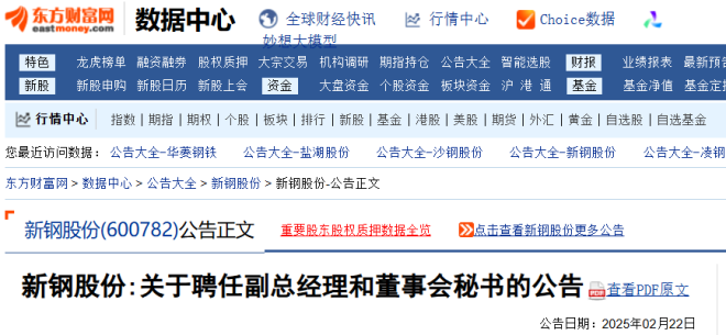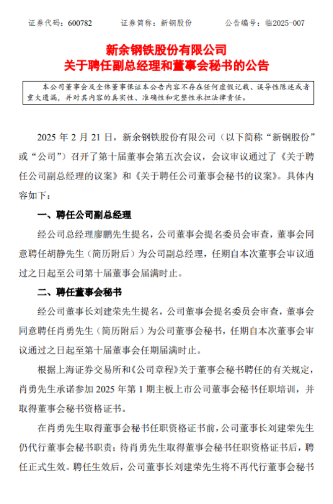 2月22日,新鋼股份發(fā)布了《新余鋼鐵股份有限公司關于聘任副總經(jīng)理和董事會秘書的公告》(以下簡稱《公告》)。