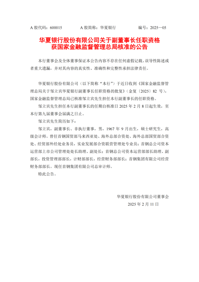 其中顯示,華夏銀行股份有限公司(以下簡稱“本行”)于近日收到《國家金融監督管理總局關于鄒立賓華夏銀行副董事長任職資格的批復》(金復〔2025〕82 號),國家金融監督管理總局已核準鄒立賓先生擔任本行副董事長的任職資格。