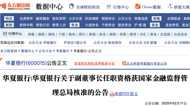 同期,2月11日,華夏銀行發布《關于副董事長任職資格獲國家金融監督管理總局核準的公告》。