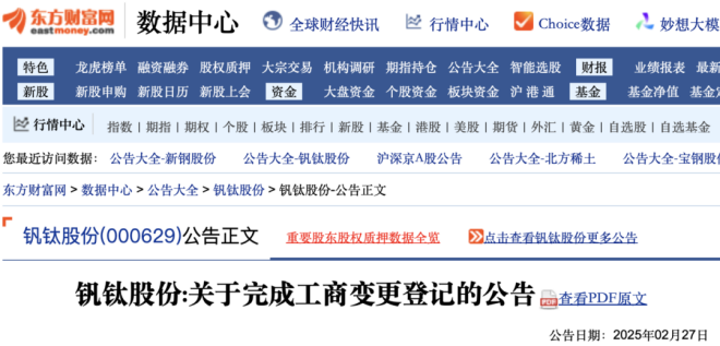 2月27日,釩鈦股份發布《關于完成工商變更登記的公告》。