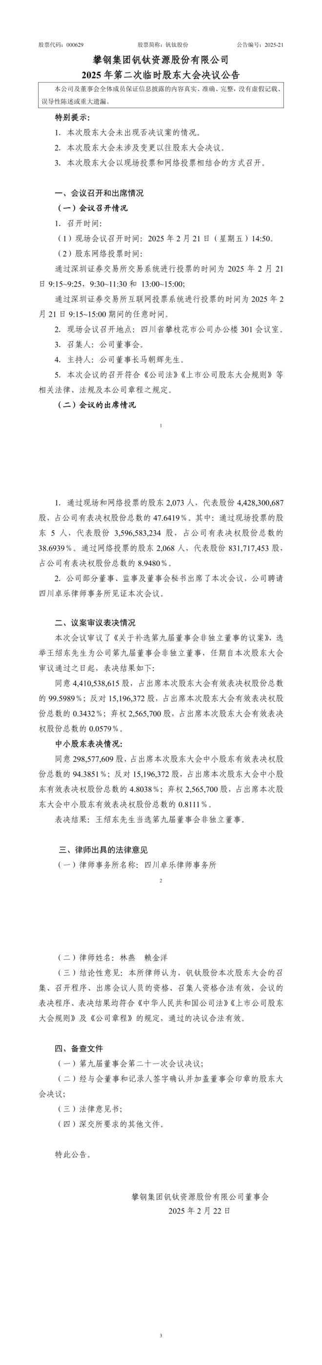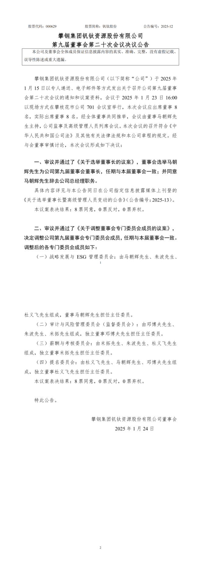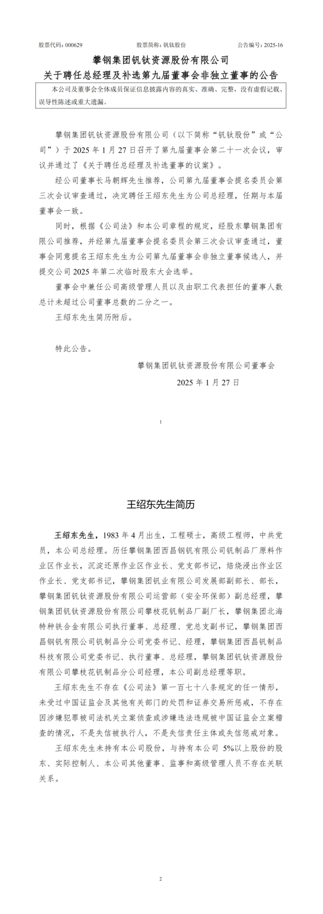 其中提到,攀鋼集團釩鈦資源股份有限公司(以下簡稱“公司”)2025 年第二次臨時股東大會審議通過了《關于補選第九屆董事會非獨立董事的議案》,補選王紹東先生為公司第九屆董事會非獨立董事;第九屆董事會第二十次會議審議并通過了《關于選舉董事長的議案》,選舉馬朝輝先生為公司第九屆董事會董事長;第九屆董事會第二十一次會議審議并通過了《關于聘任總經理及補選董事的議案》,聘任王紹東先生為公司總經理。 具體情況詳見公司有關公告。