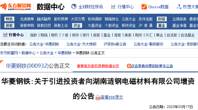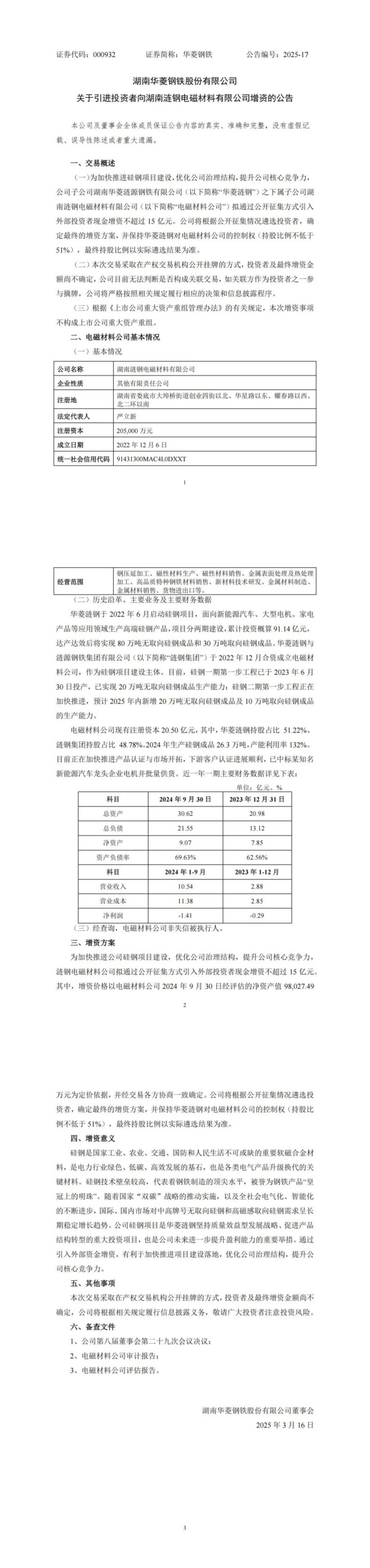 3月17日,華菱鋼鐵發布了關于引進投資者向湖南漣鋼電磁材料有限公司增資的公告。