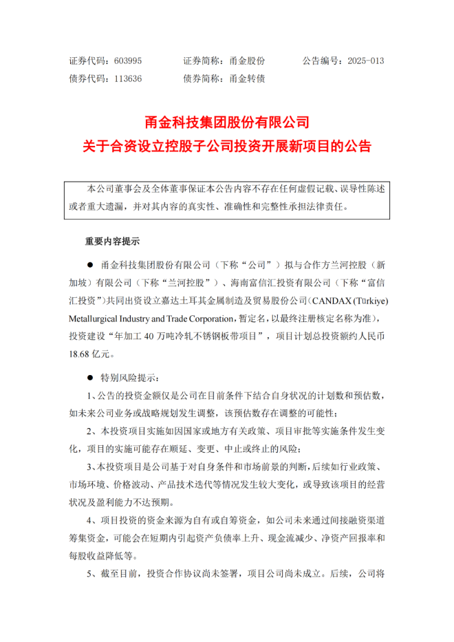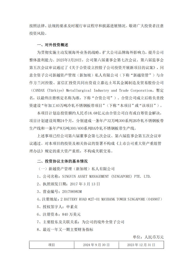 3月22日,甬金股份發(fā)布了《關(guān)于合資設(shè)立控股子公司投資開展新項(xiàng)目的公告》(以下簡(jiǎn)稱《公告》)。