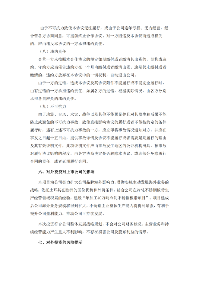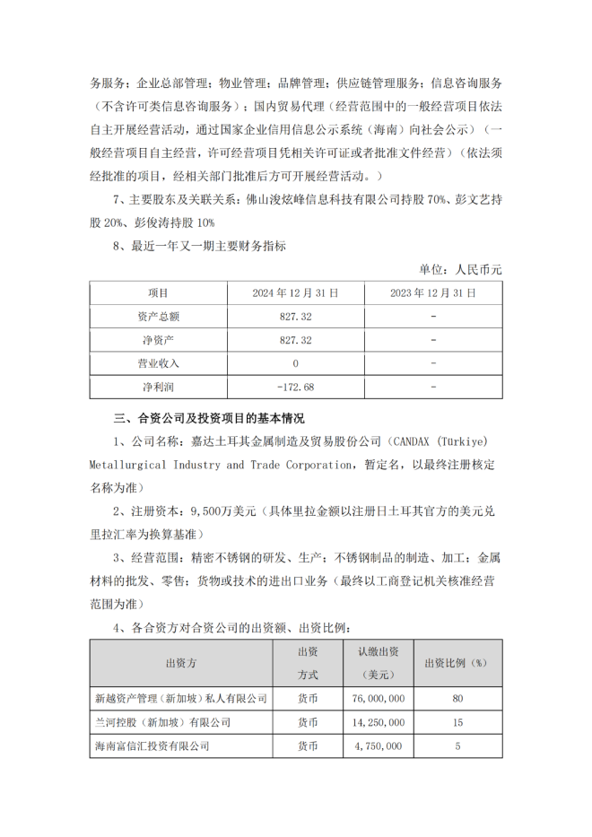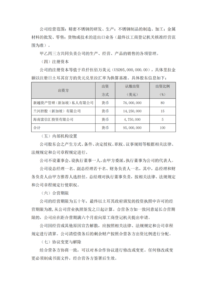 從《公告》中獲悉,甬金科技集團(tuán)股份有限公司公司計(jì)劃與蘭河控股有限公司、海南富信匯投資有限公司共同設(shè)立嘉達(dá)土耳其金屬制造及貿(mào)易股份公司,并以合資公司為主體,在土耳其亞洛瓦機(jī)械專業(yè)化組織工業(yè)區(qū)投建“年加工40萬(wàn)噸冷軋不銹鋼板帶項(xiàng)目”。
