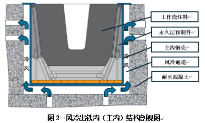 根據(jù)上述情況,聯(lián)合榮大專家組采用鋼殼風(fēng)冷技術(shù)(見下圖2),提高了出鐵溝的安全性及壽命。該技術(shù)采取的措施:是在主溝鋼殼和耐火混凝土之間不作填充,留出空腔作為風(fēng)冷通道,在溝底和溝幫上開設(shè)通風(fēng)孔;鋼殼內(nèi)部貼一層10mm厚的納米絕熱板,永久層采用高強(qiáng)度的大型預(yù)制塊進(jìn)行拼裝,最后澆注主溝工作層。