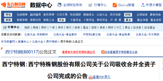 4月3日,西寧特鋼發(fā)布了《西寧特殊鋼股份有限公司關于公司吸收合并全資子公司完成的公告》(以下簡稱《公告》)。