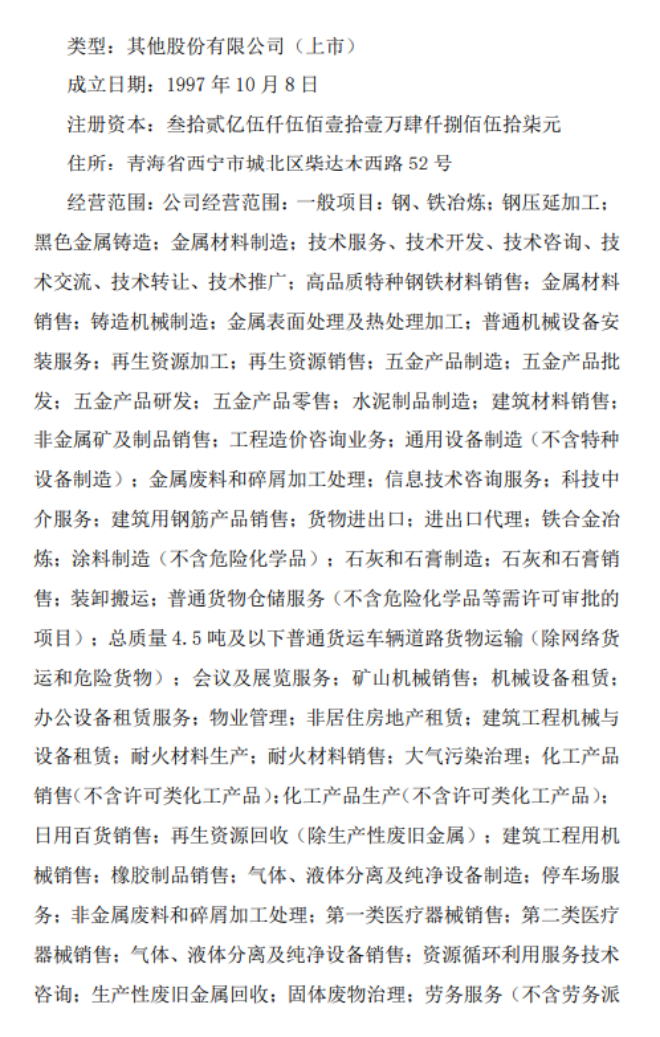 西寧特鋼已經完成吸收合并后變更登記手續(xù),已承繼全部資產、負債、權益、業(yè)務、職工等,于2025年4月1日取得青海省市場監(jiān)督管理局頒發(fā)的營業(yè)執(zhí)照。
